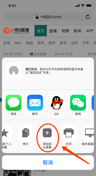 3、在弹出的分享窗口中,单击“添加到主屏幕”